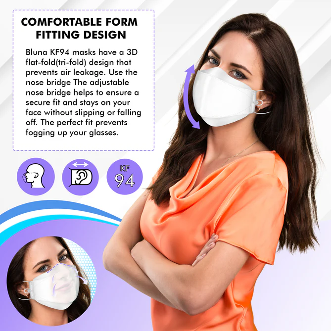 Bluna Facefit KF94 Adjustable Adult Face Mask in White. Crafted with comfort and protection in mind, this face mask is designed for adults seeking a high-quality mask that fits seamlessly into their daily routine. With its adjustable straps, the Bluna Facefit KF94 ensures a secure and personalized fit, providing peace of mind wherever you go.